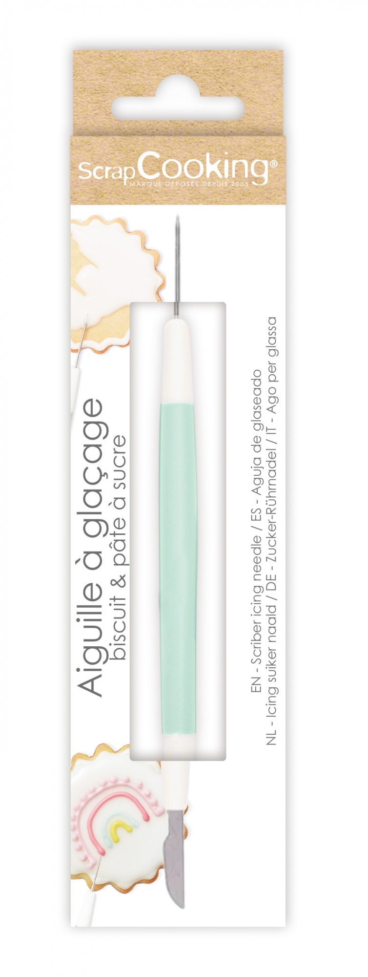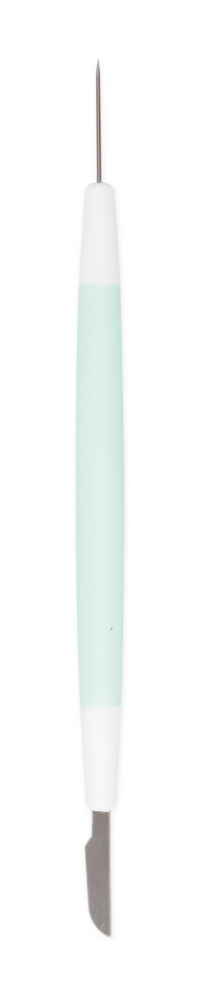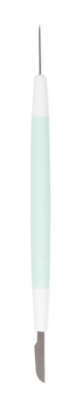 Ustensile multifonction permettant d'enlever les bulles d'air dans le glaçage royal avec la pointe, et de couper pâtes à sucre et autre préparation avec l'outil de l'autre côté.